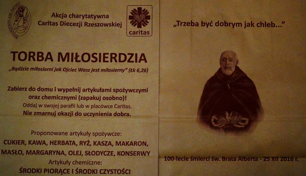 W diecezji rzeszowskiej od 19 listopada, czyli od I Światowego Dnia Ubogich trwa akcja "Torba Miłosierdzia". Caritas - katolicka organizacja charytatywna przekazuje torby, do których możemy zapakować różne produkty. Torby można sobie zabrać do domu, a znajdują się one na stoliku przy prasie katolickiej. Torby Miłosierdzia składamy najpóźniej do 13 grudnia w zakrystii u p. Zakrystianki.