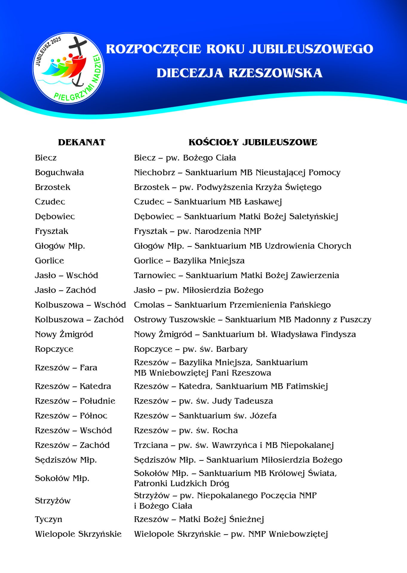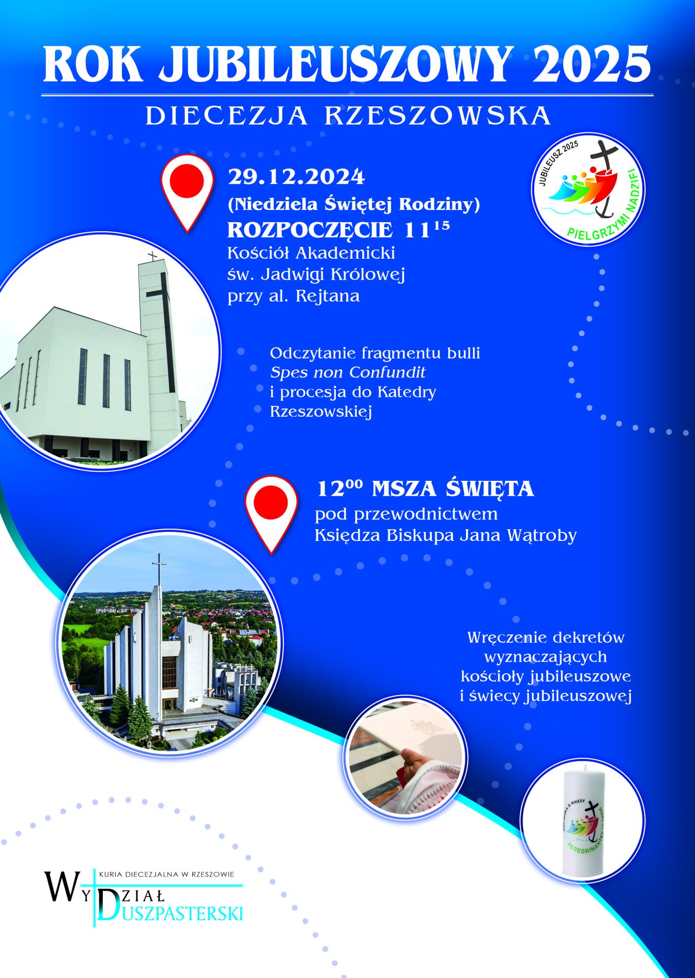 Rok Jubileuszowy w diecezji rzeszowskiej zostanie zainaugurowany oficjalnie w Niedzielę Świętej Rodziny 29 grudnia 2024, podobnie jak w innych diecezjach. W akademickim kościele św. Jadwigi w Rzeszowie o godz. 11:15 rozpocznie się liturgia z odczytaniem fragmentu bulli „Spes non confundit”, ogłaszającej Rok Święty, i procesją ulicami miasta z ewangeliarzem, święcą jubileuszową i krzyżem do kościoła katedralnego, w którym odbędzie się Eucharystia. Do udziału w tej liturgii są zaproszeni wszyscy diecezjanie.