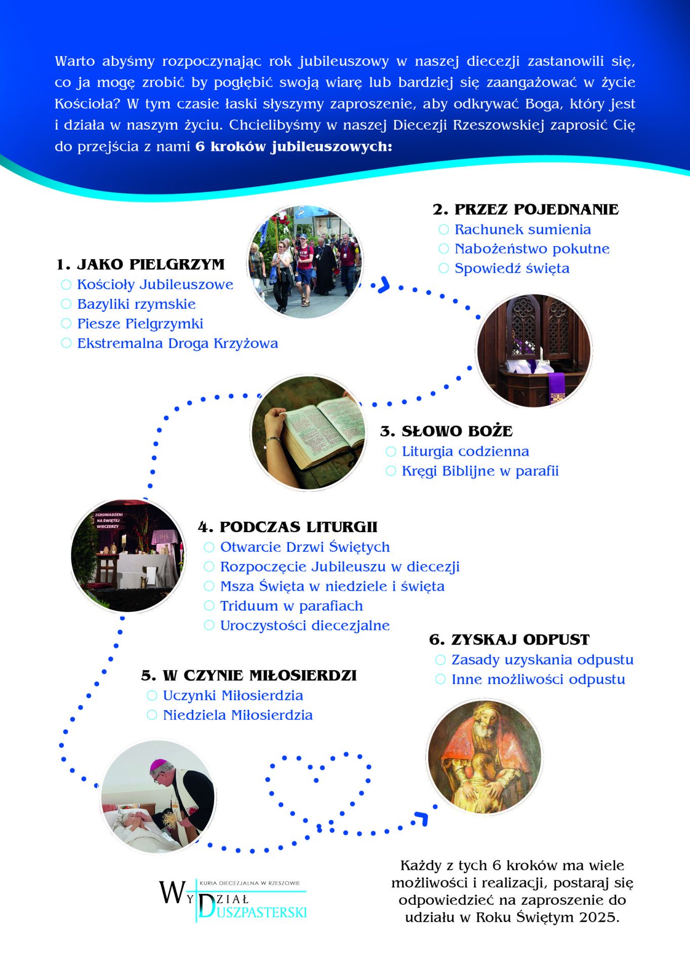 W naszej diecezji biskup Jan Wątroba ustanowił 25 kościołów jubileuszowych, w których będzie można zyskać odpusty zupełne związane z Rokiem Świętym. Można je uzyskać pod określonymi warunkami. „Są to: stan łaski uświęcającej i brak jakiegokolwiek przywiązania do grzechu, Komunia Święta i modlitwa w intencjach Ojca Świętego. Do tych podstawowych warunków dochodzi jeszcze tzw. dzieło jubileuszowe. Pod tym określeniem rozumieć należy każdą z trzech wymienionych niżej aktywności (oczywiście dla uzyskania odpustu wystarczy jedno z tych dzieł). Pierwsza to pielgrzymka do miejsca jubileuszowego, czyli kościoła jubileuszowego. Drugie dzieło to samo tylko nawiedzenie wskazanego kościoła, powiązane z modlitwą i czasem poświęconym na adorację. Trzecie to dzieła miłosierdzia i pokuty, czyli udział w misjach, rekolekcjach, spotkaniach formacyjnych, odwiedzenie i poświęcenie czasu braciom znajdującym się w potrzebie, w trudnej sytuacji (chorym, więźniom, samotnym, osobom starszym i niepełnosprawnym) oraz każde działanie wyrażające ducha pokuty (np. post czy wstrzemięźliwość). Jak podkreśla Papież Franciszek, że przy okazji postu ważne jest przekazanie wsparcia materialnego ubogim. Reasumując, aby uzyskać odpust jubileuszowy należy spełnić podstawowe warunki i jedno z dzieł jubileuszowych (pielgrzymka/nawiedzenie/dzieło miłosierdzia lub pokuty).